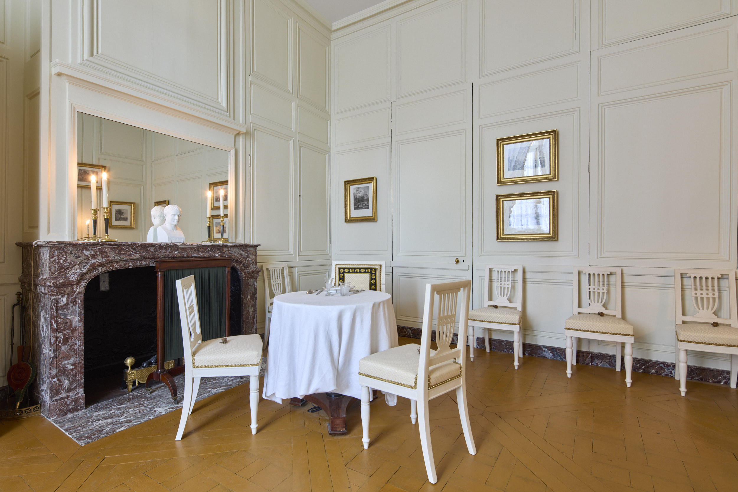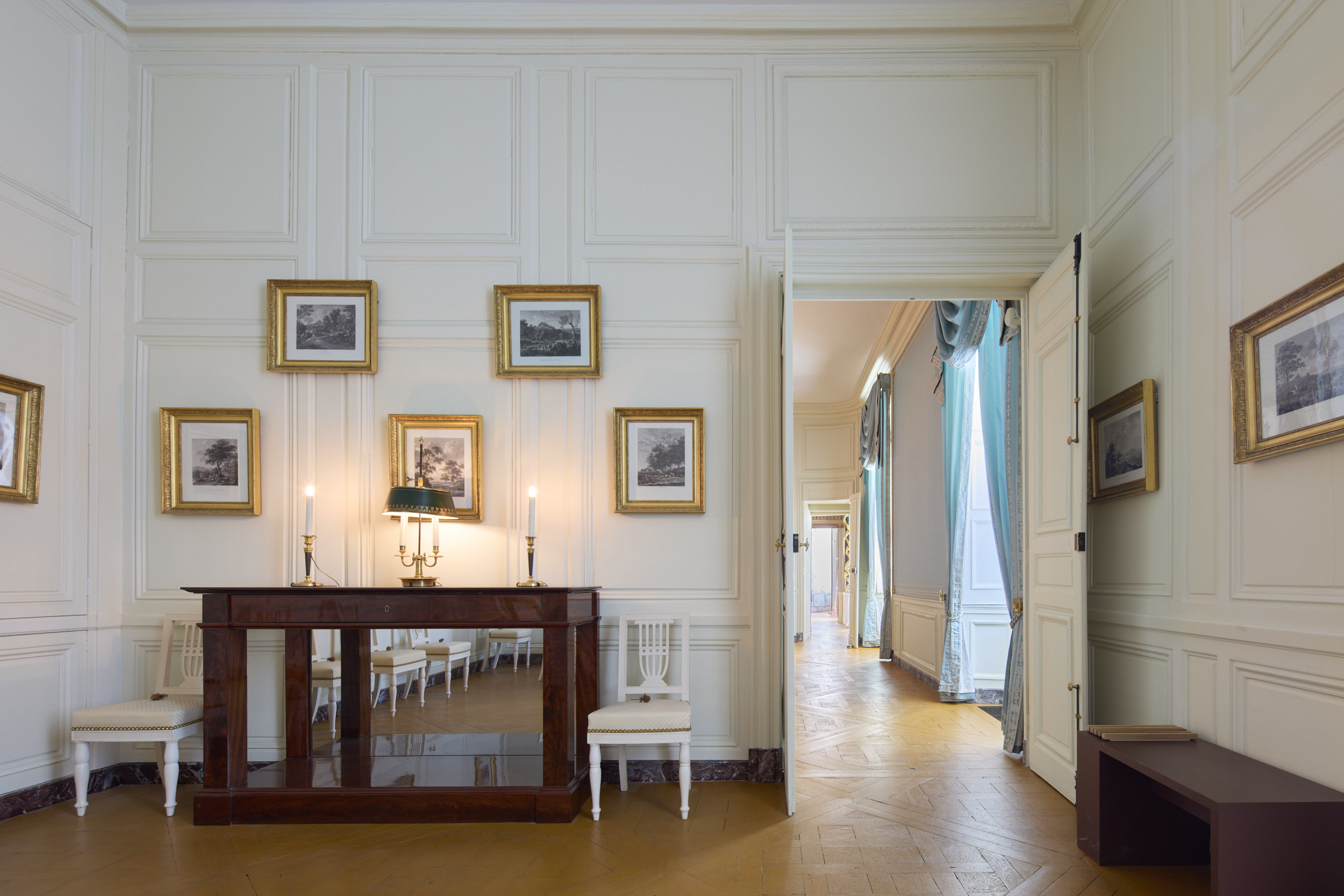 Un important travail de recherche documentaire a été mené afin de définir un parti de restauration cohérent pour l’ensemble de l’enfilade, visant à restituer son état Empire. Approuvé par la DRAC, ce travail a permis d’élaborer un programme de restauration des intérieurs destiné à remettre en valeur cet ensemble historique, en tenant compte à la fois de l’état de conservation des éléments encore en place et de leur intérêt patrimonial.