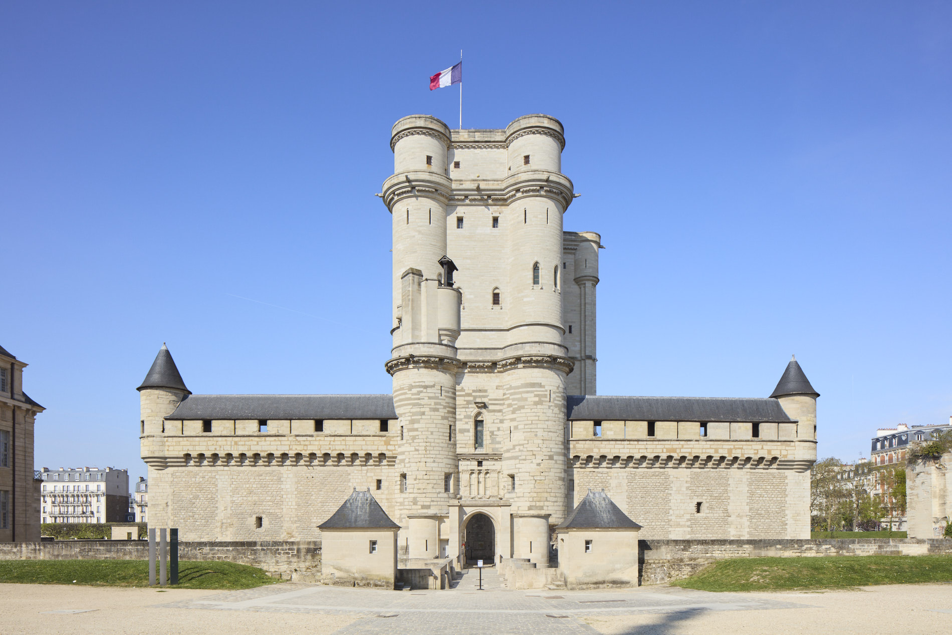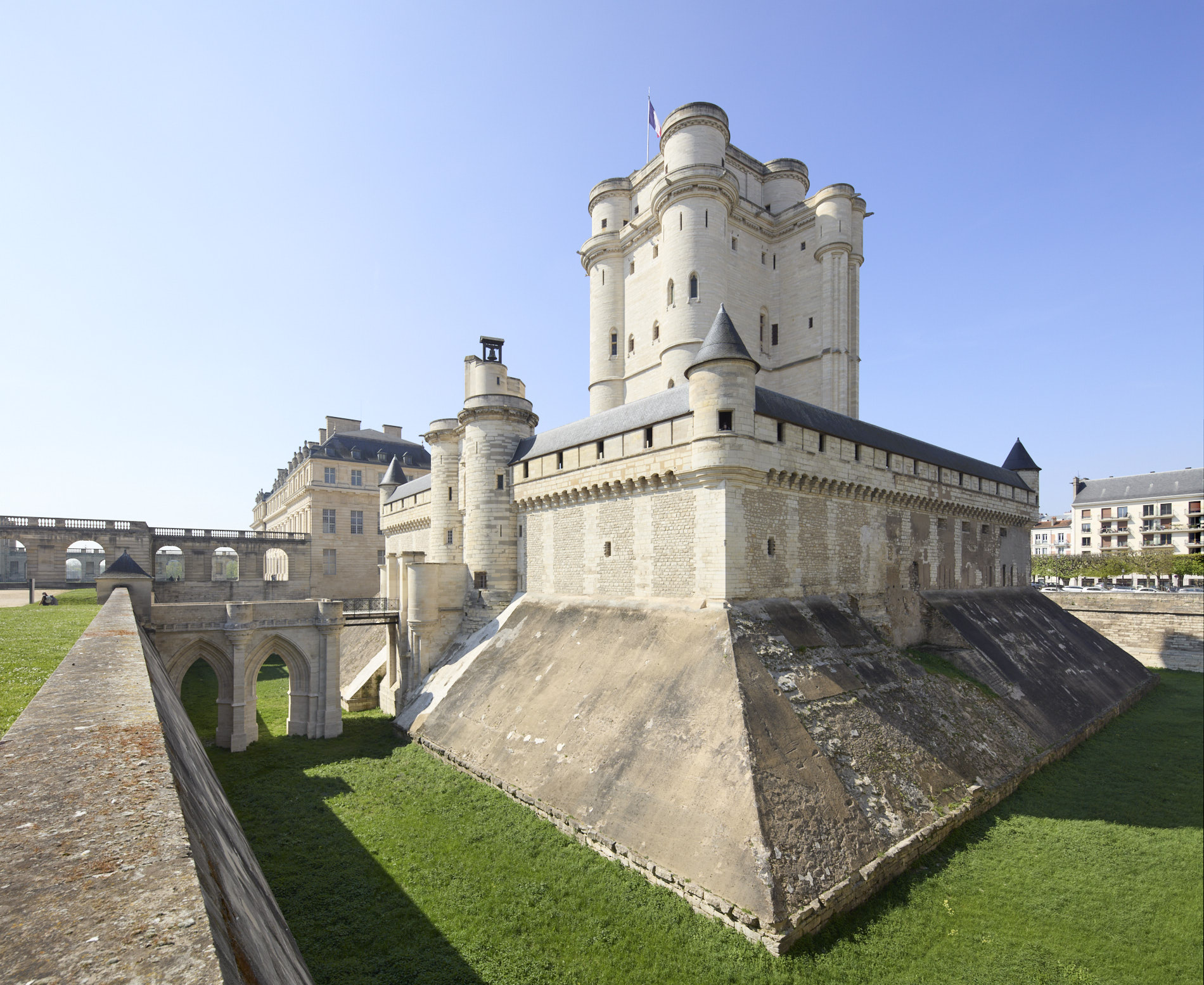 Édifié à partir du XIVᵉ siècle sur les vestiges d’un pavillon de chasse, le château de Vincennes demeure le plus vaste château fort de France. Achevé sous Charles V, son donjon culmine à 52 mètres et son enceinte d’un kilomètre, flanquée de neuf tours, fut complétée par la Sainte-Chapelle fondée en 1379.