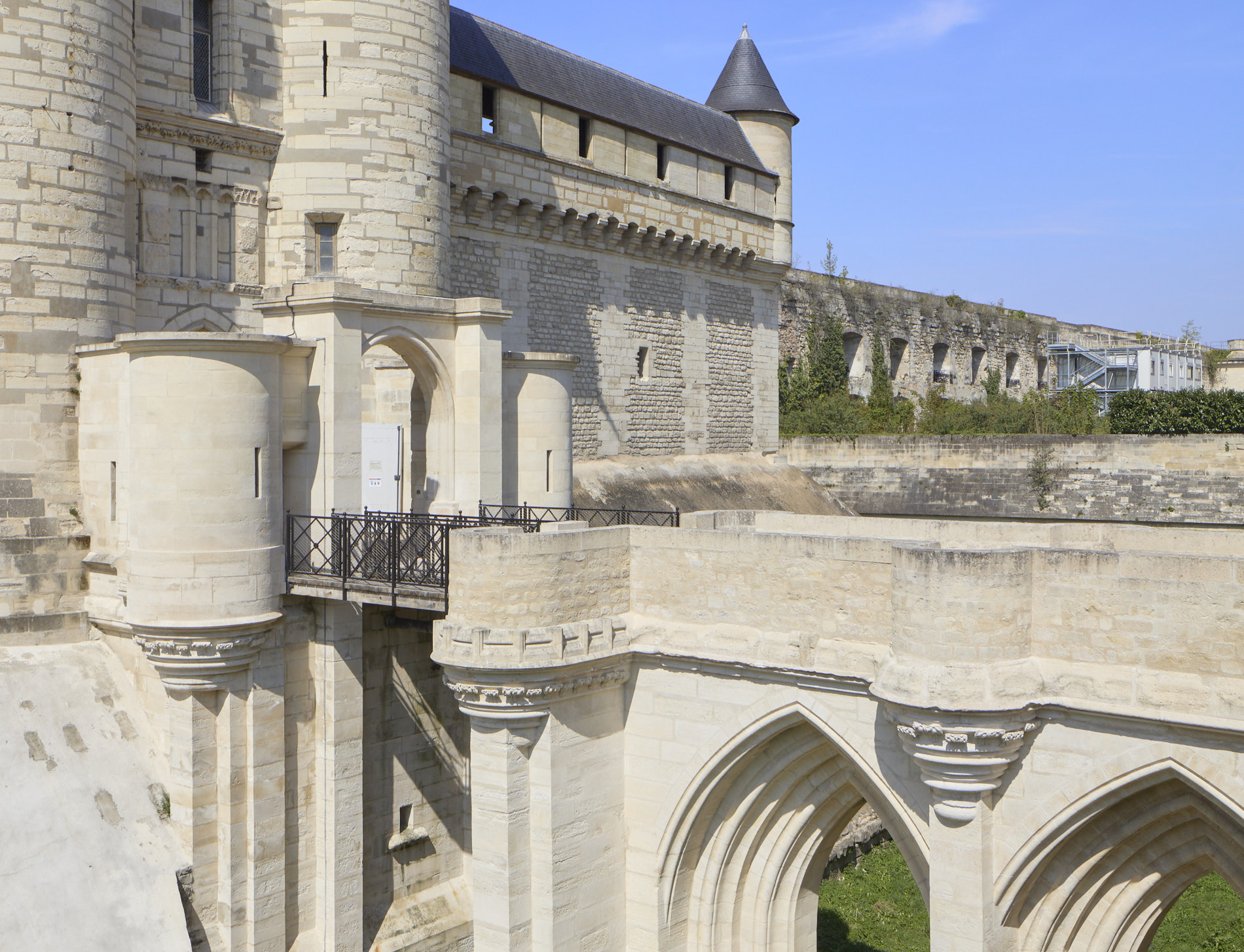 Le pont dormant du donjon relie la cour médiane au dispositif défensif du châtelet. Remblayé plus d’un siècle entre les années 1850 et 1950, il présentait jusqu’à récemment des désordres critiques : étanchéité défaillante, inondations régulières du tablier, passerelles étayées, effondrement partiel du glacis. Livrée en 2023, l’opération menée par l’agence a eu pour objectifs la stabilisation structurelle, l’assainissement et la mise en valeur de cet accès emblématique. Les interventions ont porté sur la récupération et l’évacuation des eaux pluviales, la réfection complète de l’étanchéité et du revêtement du tablier, la restauration en pierre dure calcaire des parements du pont et des façades de la barbacane, ainsi que la reconstruction des deux passerelles, charretière et piétonnière, adaptées aux contraintes contemporaines d’usages tout en évoquant les anciens pont-levis médiévaux. Les glacis moellonnés modernes de la chemise du donjon ont également été remis en état.